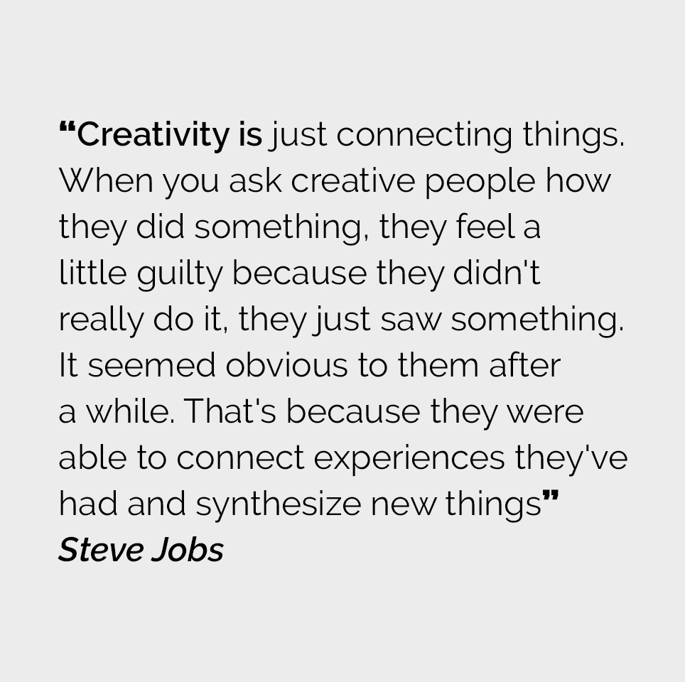 I think of my self as a creative hub, a dot connector, a people watcher, a collector of ideas and experiences. I am a sponge for information and influences. I constantly absorb details from my environment and form them into creative solutions. When a question is posed, the creative cogs are already turning in anticipation.