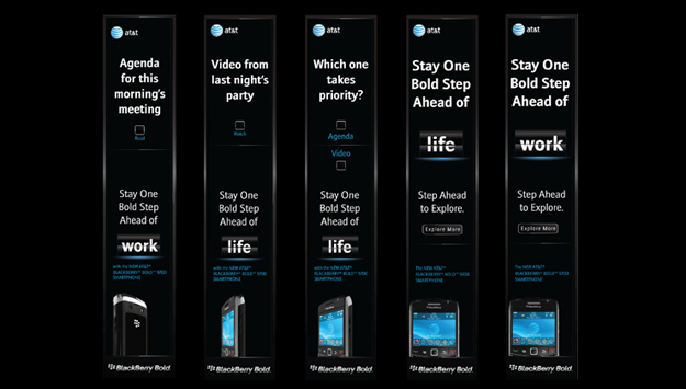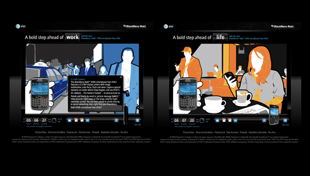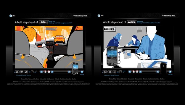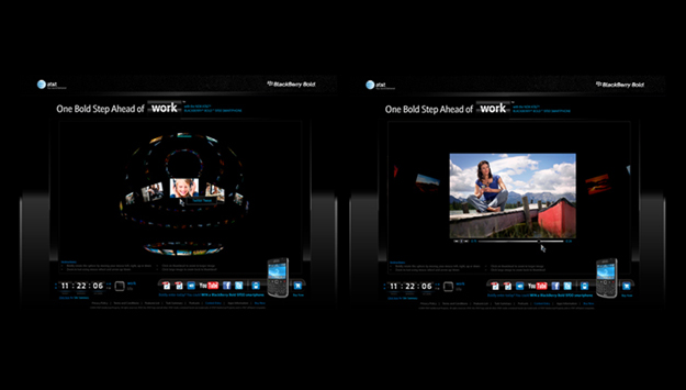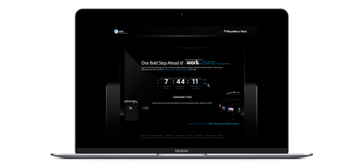 BlackBerry and AT&T wanted to generate awareness and educate consumers on the benefits of the BlackBerry Bold 9700 Smartphone from AT&T. The goal was to create demand in both consumers and B2B technology purchasers. The solution was ‘A Bold Step Ahead’ a fully comprehensive website that immersed the user in a ‘smart’, educational and interactive experience. The website was designed to showcase the device’s ability to stay ahead of the work-life balance. The site design was made to accent the device’s looks, whilst modern, vivid images placed the product into an everyday context, work or play. Strategically targeted animated online banner placements were used to drive awareness and garner visits. The site experience invited the user to explore and learn, yet promoted a deeper layer of interactivity with added contest entry and data capture via social media sites such as youtube and twitter. There was also an added connection to the user via viral messaging and interactive social media web banners. The homepage of the site greeted the user with a clock that synced with the user's computer clock. Based on the time that the user visited the site, either a work or life situation would be the greeting scenario. The user was then invited to explore each work/life scenario and gradually become educated on the device via interactive rollovers, podcasts, and shareable content. The user was then invited to share the site as a contest entry to win a device or enter via a tweet, facebook post or youtube link that displayed how they stayed ‘One Step Ahead’ of the work/life balance.