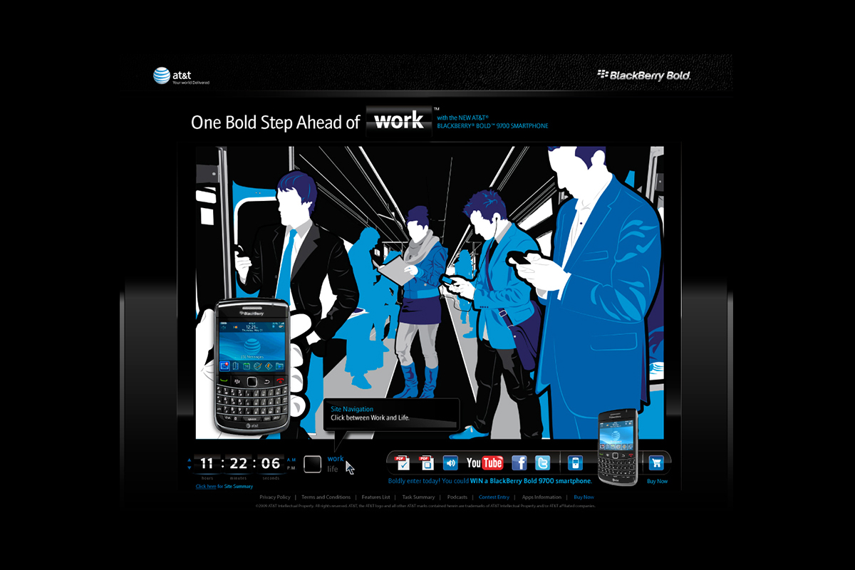 BlackBerry and AT&T wanted to generate awareness and educate consumers on the benefits of the BlackBerry Bold 9700 Smartphone from AT&T. The goal was to create demand in both consumers and B2B technology purchasers. The solution was ‘A Bold Step Ahead’ a fully comprehensive website that immersed the user in a ‘smart’, educational and interactive experience. The website was designed to showcase the device’s ability to stay ahead of the work-life balance. The site design was made to accent the device’s looks, whilst modern, vivid images placed the product into an everyday context, work or play. Strategically targeted animated online banner placements were used to drive awareness and garner visits. The site experience invited the user to explore and learn, yet promoted a deeper layer of interactivity with added contest entry and data capture via social media sites such as youtube and twitter. There was also an added connection to the user via viral messaging and interactive social media web banners. The homepage of the site greeted the user with a clock that synced with the user's computer clock. Based on the time that the user visited the site, either a work or life situation would be the greeting scenario. The user was then invited to explore each work/life scenario and gradually become educated on the device via interactive rollovers, podcasts, and shareable content. The user was then invited to share the site as a contest entry to win a device or enter via a tweet, facebook post or youtube link that displayed how they stayed ‘One Step Ahead’ of the work/life balance.