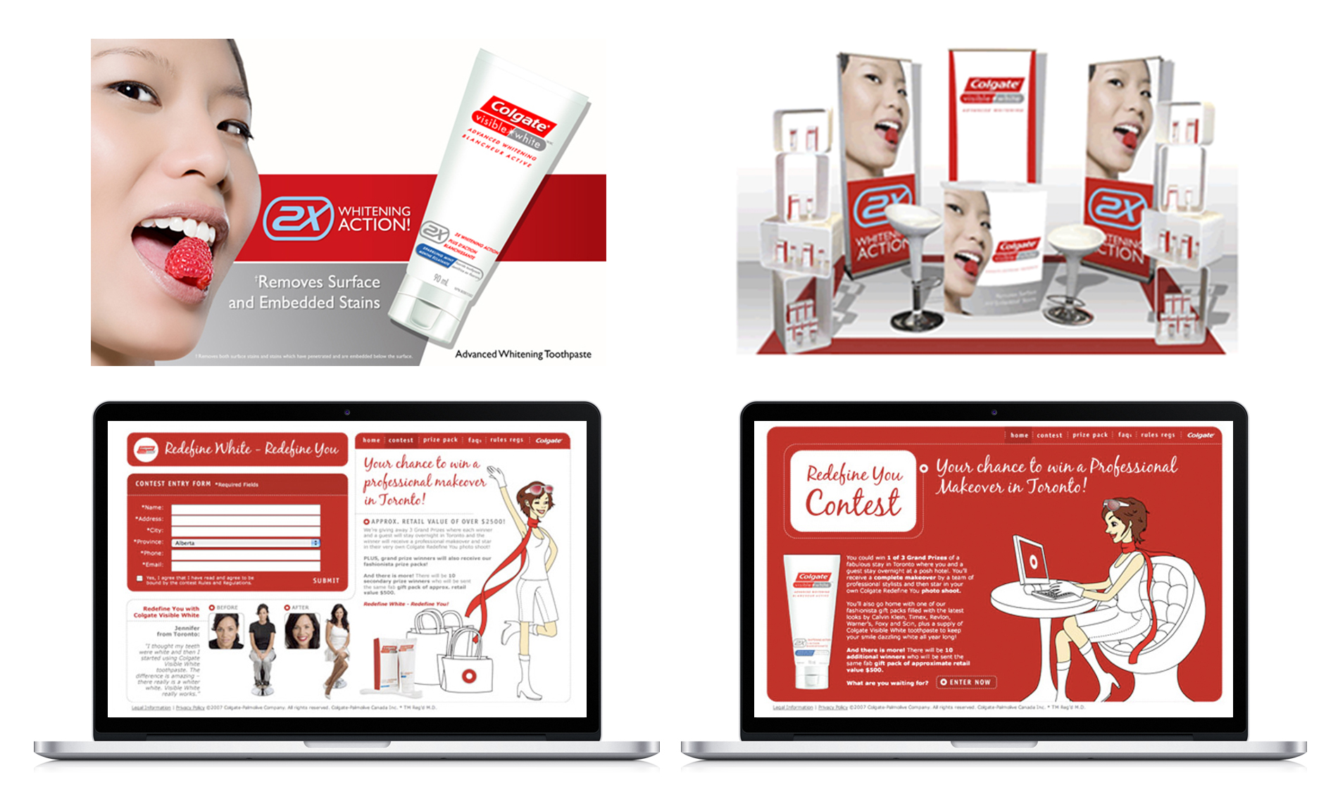 To launch the Colgate Visible White in Canada, the opportunity was taken for Colgate to talk about the real end-benefits for consumers and break through the clutter at retail, with a hands-on, personal approach. The opportunity was available to position this product as much more than toothpaste and more of a beauty ‘enhancing’ product that is used to achieve a ‘whiter than white’ smile. In spite of the strong efficacy claims, Colgate decided to follow our recommendation of leading with the cosmetic benefits when going to market. The product was brought to life at retail with an ad campaign that featured a confident, sexy, slightly cheeky young woman, who is showing off her pearly whites, whilst biting on a bright red berry. This brought even more emphasis on the whiteness of her teeth and helped reinforce the brand’s colours. This theme was used again in spearheading the public relations and experiential marketing campaigns. The new strategy became the platform for the future development of the above the line national campaign. The campaign also became the theme for the Chinese, Hong Kong market. Continuing the Colgate Visible White marketing efforts with a direct mail booklet inserted in popular women’s magazines such as Flare and Lou Lou. The Summer White theme was all about achieving your hot summer look in white. Partners including Revlon, Timex, Foxy and Calvin Klein were brought on-board to contribute prizes in exchange for featuring their products in the booklet. The DM piece led the audience to a microsite where consumers had a chance to win a trip to Toronto and get a makeover by professional beauty stylists. Then the winners starred in their own ‘Redefine You’ photo shoot and received a gift pack with products featured in the direct mail booklet.