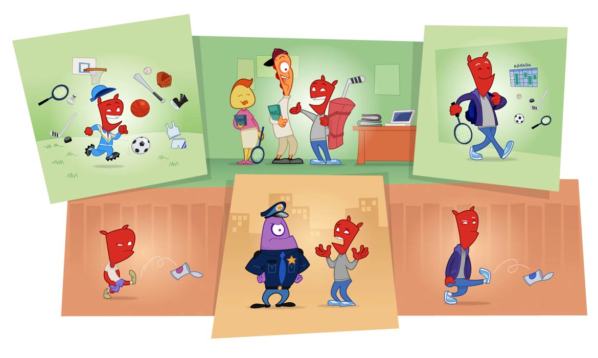 Trade For Tomorrow was a corporate social responsibility campaign initiated by a leading telecommunications company. It asked local junior sports communities (hockey, soccer, etc) to collect e-waste from their surrounding neighbourhoods. The e-waste was picked up and recycled. Each team was given points based on the amount of e-waste recycled. The points amounted to prizing and donations to their sports team and facility. I created a team of characters that instructed the participating teams on how to enter and take an active role in the campaign. The team of characters also educated participants on the benefits of recycling on a one-stop website full of resources, rebates, tips, and tools.