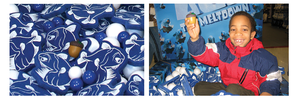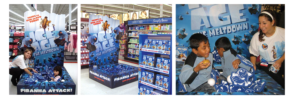 The objective was to create a buzz at the retail level, drive awareness of the new Ice Age DVD release and push sales in Wal-Marts across key markets in Canada. By creating an experiential marketing concept that brought the essence of the film to life, I gave consumers a unique and memorable brand experience that helped drive sales of the DVD release. I brought the movie to life with the ‘Piranha Attack Adventure’. Kids could try their luck at retrieving Scrat’s Acorn in a pool filled with voracious foam piranhas. Whilst field reps explained the features of the DVD to the by standing parents, kids enjoy a small experience of one the film's main character Scrat, in his ongoing mission to protect his acorn. In return for risking their lives amongst the foam piranha filled pool, the intrepid kids were rewarded with button badges and temporary tattoos for their bravery.