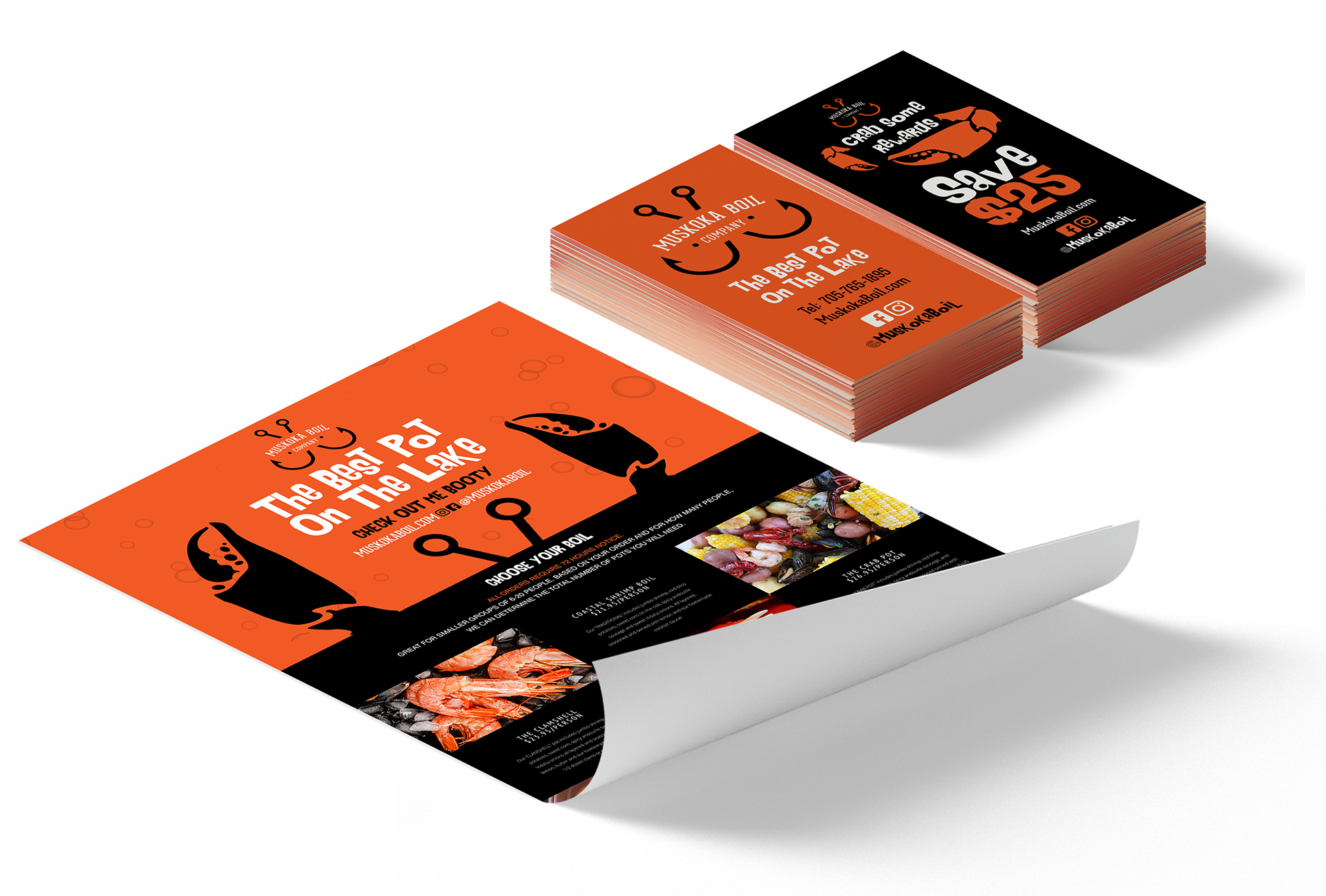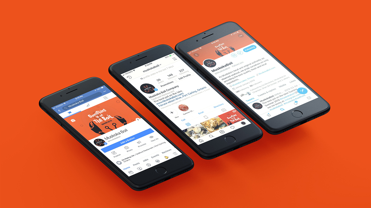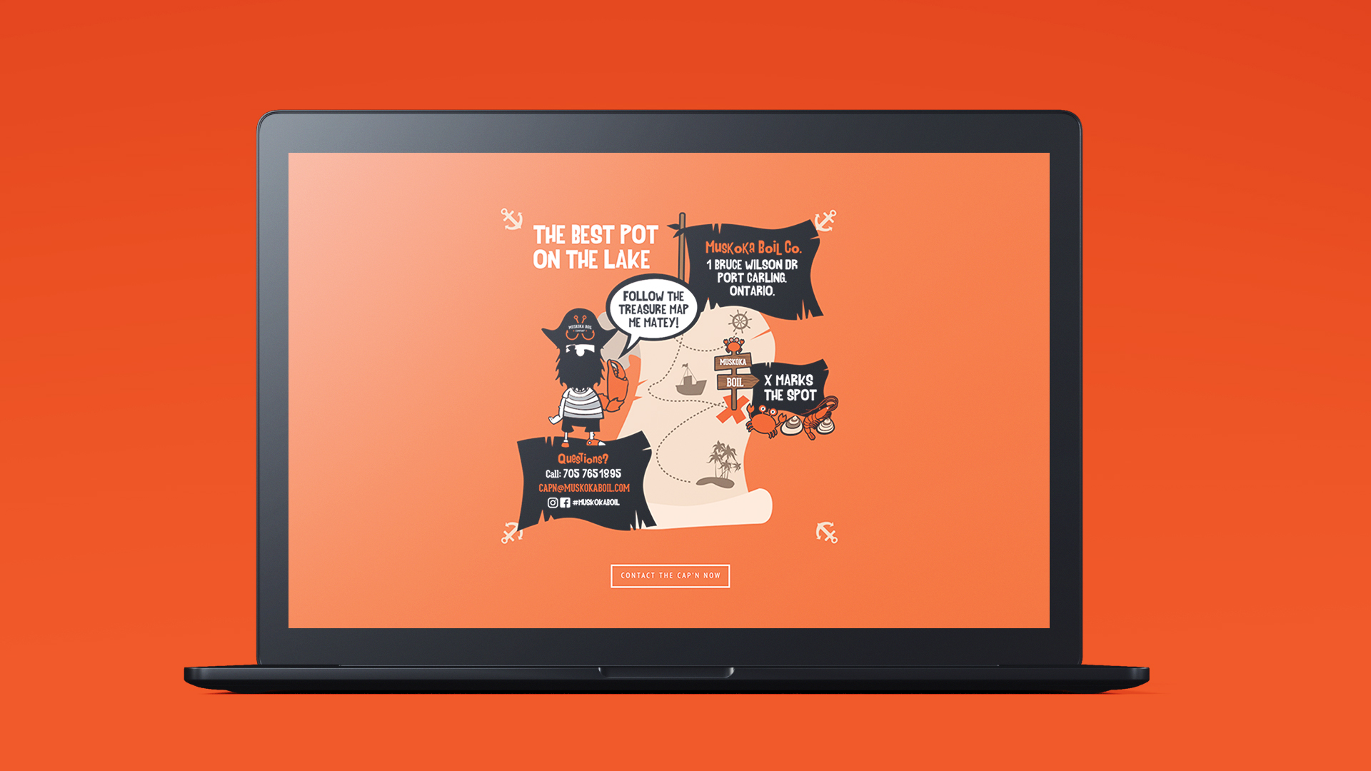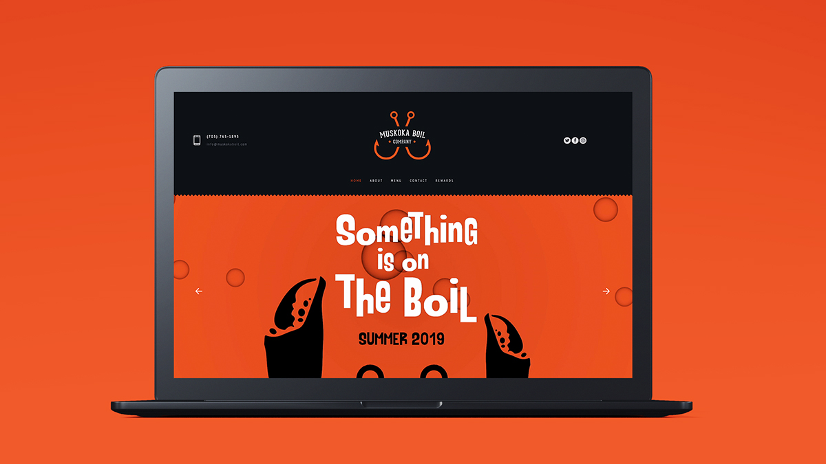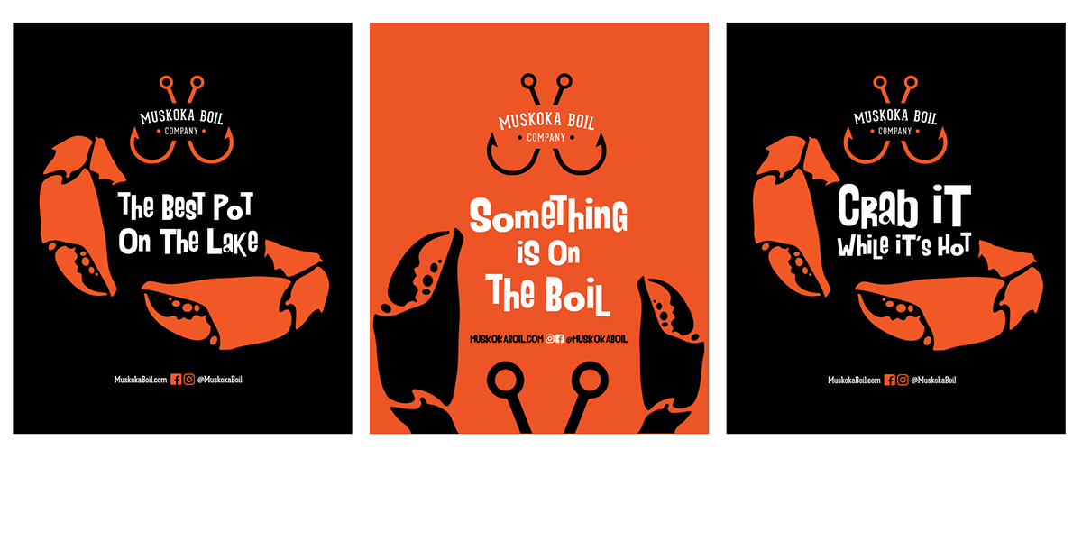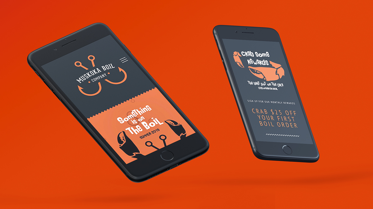 Muskoka Boil is a low country boil service located in Port Carling, Muskoka launching in Spring/Summer 2019. After working closely with the business owner on previous small business marketing projects in and around Muskoka, I took the task of creating and designing the new seafood service brand. Including building the website and creating all marketing materials for Muskoka Boil both digital and print. I decided to create something fun, that would stand out amongst the typical Muskoka businesses. I chose to use a colour palette based on a crab boil's ingredients: Crab Orange, Clamshell White, and Mussel Shell Black. The combination of the Muskoka Boil logo and the claws give the impression of a full crab. As the Local, original authority on seafood boils, Muskoka Boil prides themselves on providing the highest quality, fresh and local ingredients such as snow crab legs, clams, mussels, oysters and lobster tails. Muskoka Boil is a service of Field Of Greens, a fine food market located at Port Carling, Muskoka established in 2003. Offering fresh produce, fresh-cut, potted flowers, freshly baked bread/pastries from their on-site bakery, premium meats, fresh fish, seafood and much more.