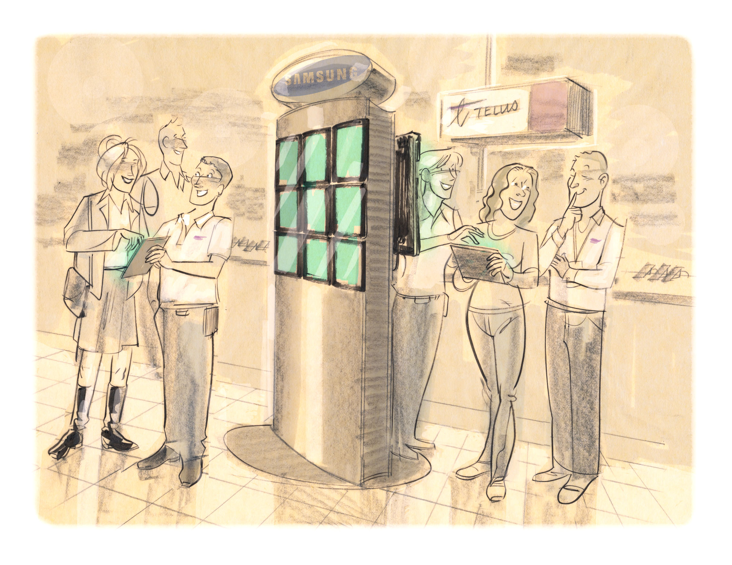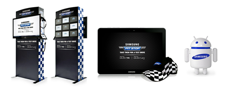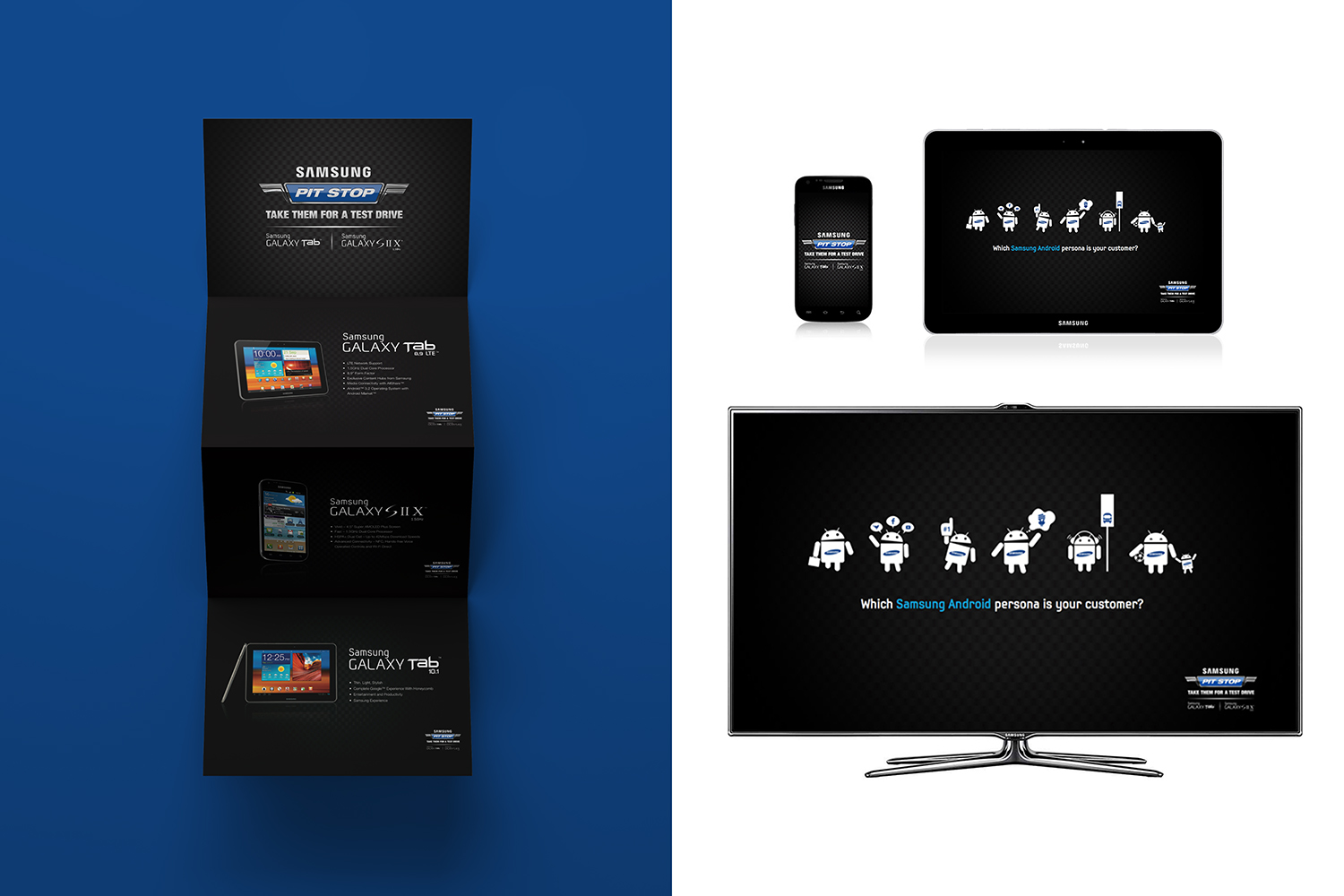 Samsung wanted to get store reps revved up and informed about the line up of feature devices for the holiday season. With the sales representatives time and retail space at a premium during the heaviest sales period of the year combined with several other competing manufacturers also bidding for attention, the training solution had to be in-and-out of the store with maximum effect and efficiency. A simple brochure, product demo, and the standard sales sheet would simply not qualify. The solution was the Samsung Pit Stop Tour. A team of trained specialists armed with a fully portable ‘pump’ of information on the Samsung devices hit the stores with a circuit of education. A Samsung Android Persona training system was developed and the reps were given an easy way to identify customer segments and the ideal feature and app demos that would best demonstrate the devices to the different audiences. The portable installation was designed to show the interactive quality of the devices as well as the evolving convergence between Samsung products in a fun hands-on experience.